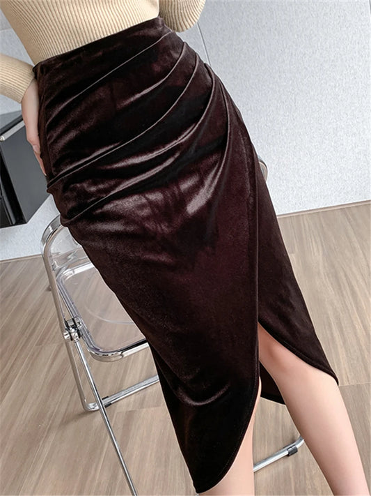 High Waist Velvet Wrap Skirt for Office Style