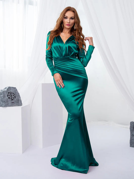 Full Sleeved V Neck Pleated Maxi Dress Elegant Floor Length Evening Party Prom Gown