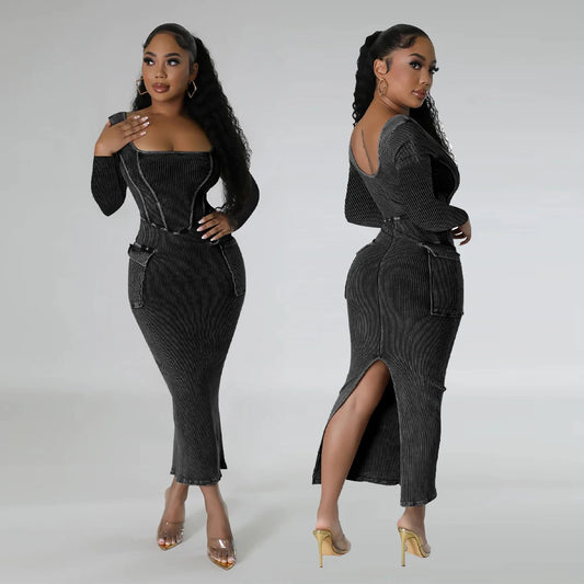 Elegant Sexy Ribbed Dress Casual Bodycon Evening Dress Women 2023 Fall Winter Clothes Club Party Long Maxi Cargo Pocket Dresses