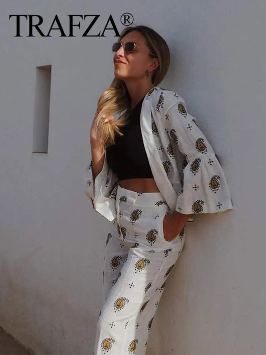 TRAFZA Women Embroidery Paisley Blouse Pant Sets Long Sleeve Cardigan Coat Straight Trousers Fashion Y2K High Street Sets