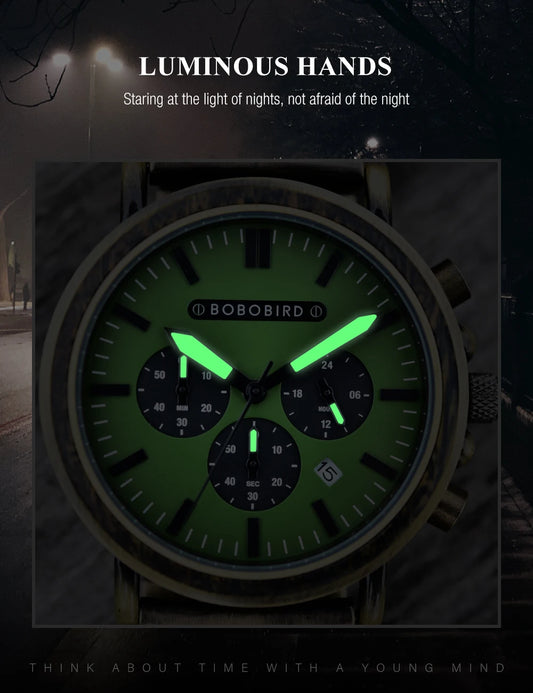 BOBO BIRD Men Watch Fashion Green Wooden Metal Quartz Watches Wristwatch Chronograph Auto Date Display Timepiece Great Gift Box
