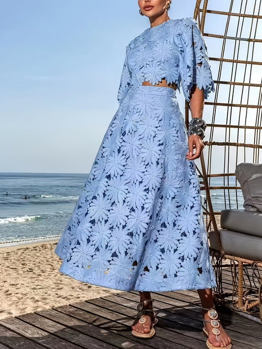 [Embroidered Top Set] High-End Embroidered Round Neck Top + Silky Midi Skirt Set | Spring and Summer New Flared Short Outfit, Vacation Water-Soluble Party