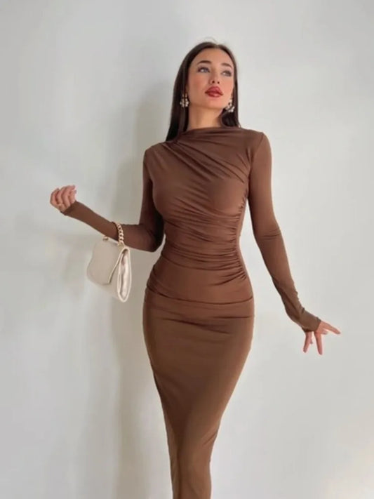 Y2k Solid Color Bodycon Party Long Dress Long Sleeve Package Hip Slim Folds Maxi Dresses For Women Elegant Vestidos Para Mujer