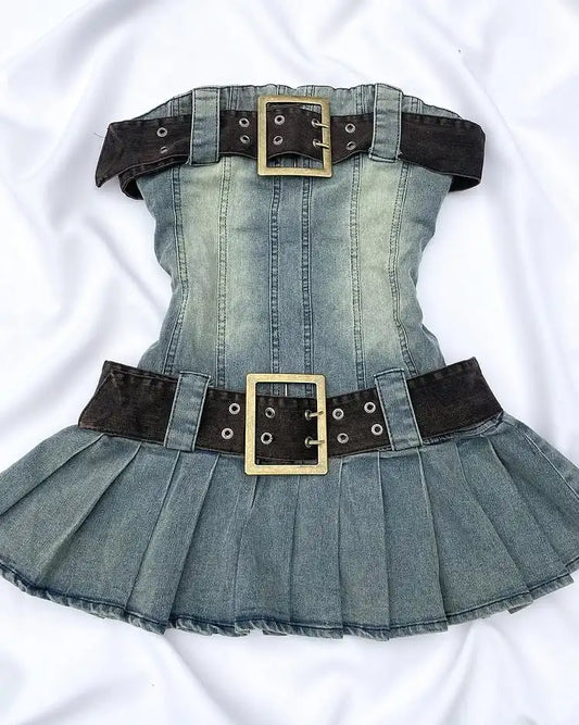 Y2K Blue Denim Mini Slim Fit Dress Harajuku Sexy Tube Dress Gothic Hot Girl Pleated Skirt Vintage Belt Dress Women Short Skirt