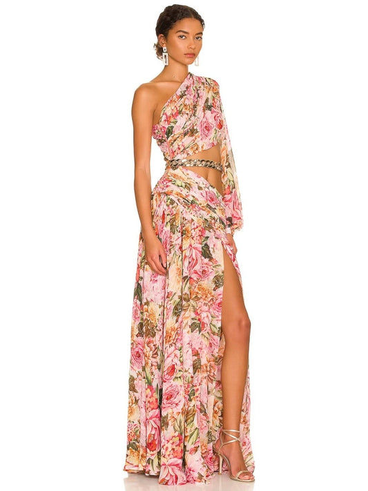 Summer Floral Print One Shoulder Maxi Dress Sexy Diagonal Neck Long Sleeve Hollow Out Chain Split Long Dress Evening Party Dress