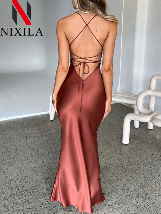 New Summer Satin Backless Lace Up Mermaid Slip Dress Women Sweetheart Neck Sexy Slim Bodycon Dresses Elegant Silk Gown Partywear