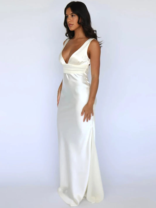 Mozision Satin V Neck Backless Sexy Maxi Dress Women Gown Elegant Sleeveless High Waist Club Party Evening Long Tank Dresses