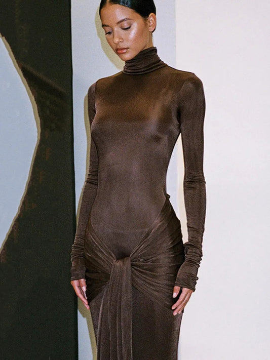 Mozision Long Sleeve Ruched Sexy Maxi Dress For Women Autumn Winter New Drawstring Turtleneck Bodycon Sexy Long Dress Elegant