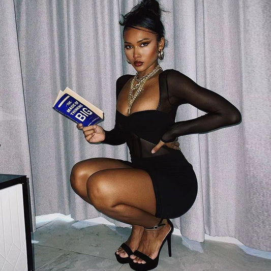 Women's sexy solid color square neck wrapped gauze long sleeve high waist and hip dress