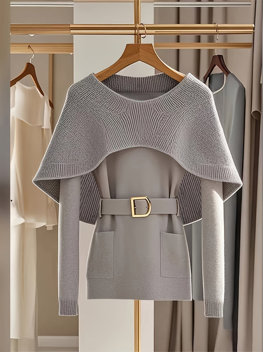 Elegant Grey Soft Polyester Crew Neck 1pc Knit Cardigan with Cape Shawl - Long Sleeve Sweater with Belt, Unique Design Solid Color Pullover for Spring/Summer/Fall - 2024 New Arrival