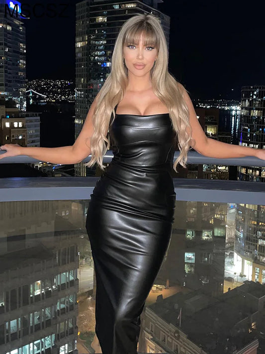 Black Faux Leather Women Dress Square Neck Sleeveless Bodycon Dress Sexy Backless Tight Midi Dress Night Club