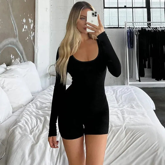 Dulzura Women 2024 Autumn Long Sleeve Streetwear Bodycon Basic Black Romper Playsuit Wholesale Items For Business P361319
