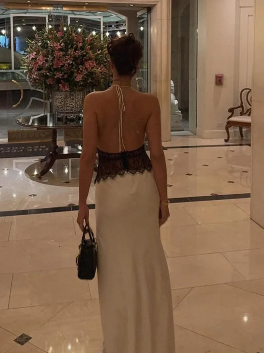 Ele Summer Long Dr Silk Satin Lace Paneling Hanging Ne Waist Inward Dra Evening Gown V-ne Svel Polyester...