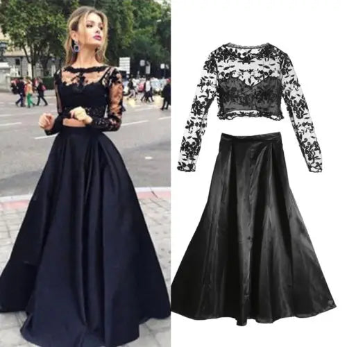 2pcs Set Elegant Formal Black Long Skirt Sexy Women Prom Long Dress Evening Party Lace Tops Long Maxi Ball Gown Skirt Hot