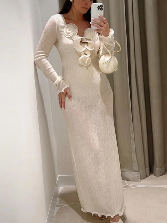 3d Floral V-neck Women Maxi Dress Solid Long Sleeve Split Slim Female Dresses 2024 Spring Summer Beachwear Ruffles Lady Robe