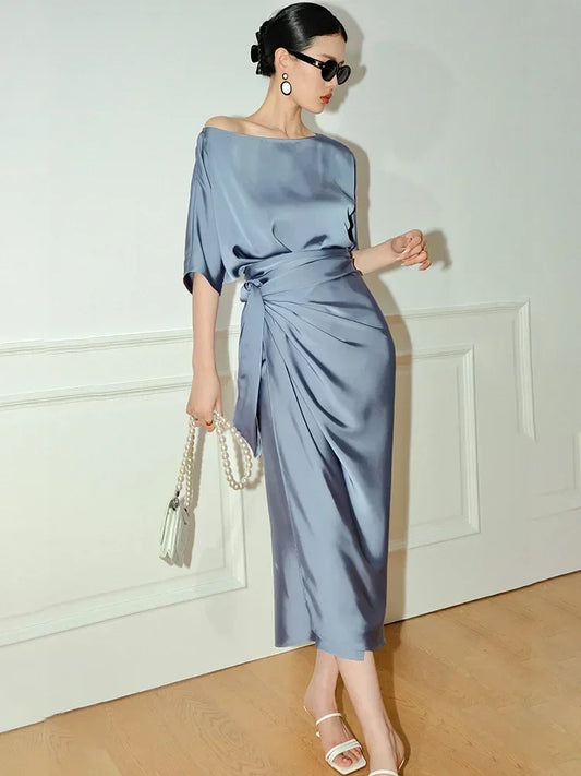 2025 New French Style Satin Dresses Women Lacing Irregular Dress Wrapped Dress Black Blue Dress Slim Waist Party Dress