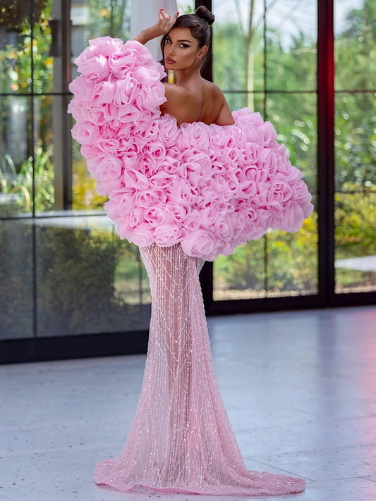 VC Illusion Pink Sequins Long Dress Pearls Embellished Strapless Cut Out Prom Luxury Cocktail Party Evening Gowns