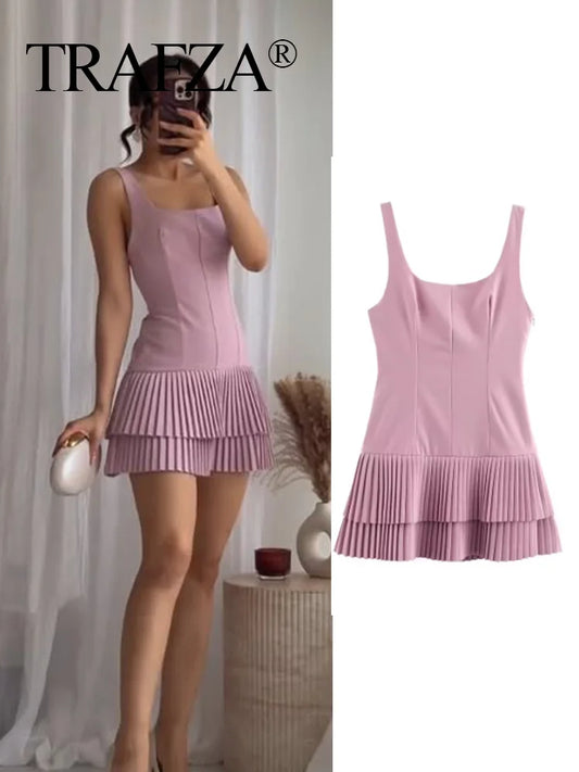 TRAFZA 2024 Woman Chic High Street Slim Short Dress Pleated Dress Women Summer Square Collar Sleeveless Solid White Mini Dress