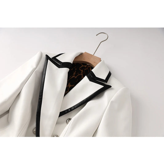 Unique Fall Winter Black Contrast Color White PU Leather Patchwork Jackets Leopard Printing Linging Luxuy Fashion Women Blazers