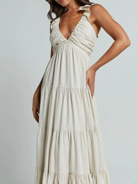Ruffles Pleated Flying Sleeve Strap Dresses Women Backless Sleeveless V-neck High Waist Long Dress 2024 Spring Summer Beach Robe