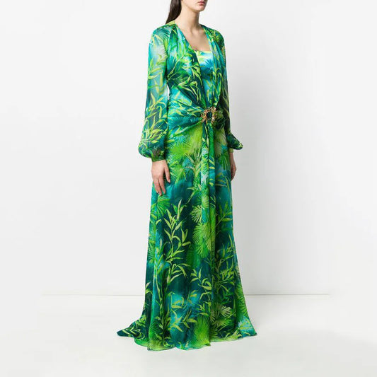 Long Green Printed Deep V-neck Dress Jewelry Buckle Banquet Dress Summer Impreso Saten Floral Formal Bridal Party Beach