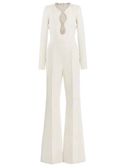 New Designer White Jumpsuit Fashion Heart Shaped Hollow Inlaid Diamond Beaded Long Sleeve Elegance Flare Pants Jumpsuit Women