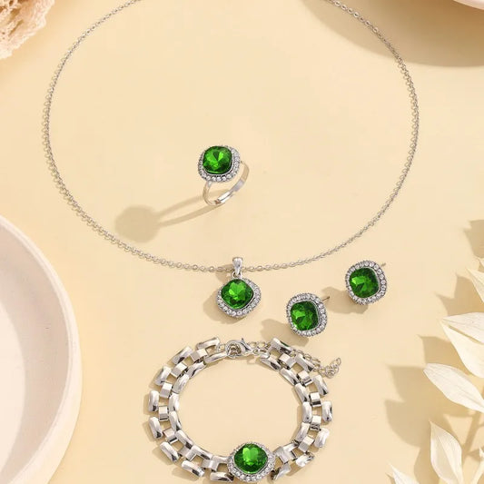 Luxury Emerald 925 Sterling Silver Jewelry Set Gemstone Pendant Bracelet Necklace and Stud Earrings Rings Simple Jewelry Set