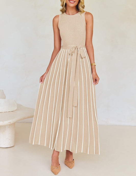 ZESICA Women's Summer Sleeveless Maxi Dress 2025 Crewneck Ribbed Knit Tie Waist Casual A Line Sweater Dresses