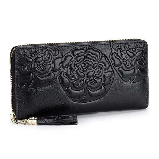 Vintage Real Cow Leather Purse Women 3D Floral Ladies Wallet Genuine Leather Clutch Bag