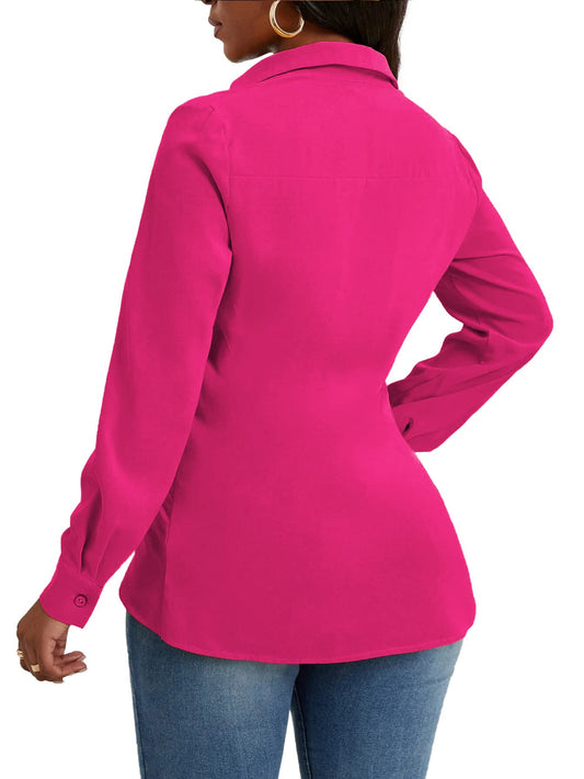 Vrtige Women's Collar V Neck Twist Front Long Sleeve Split Hem Blouse Shirt Top
