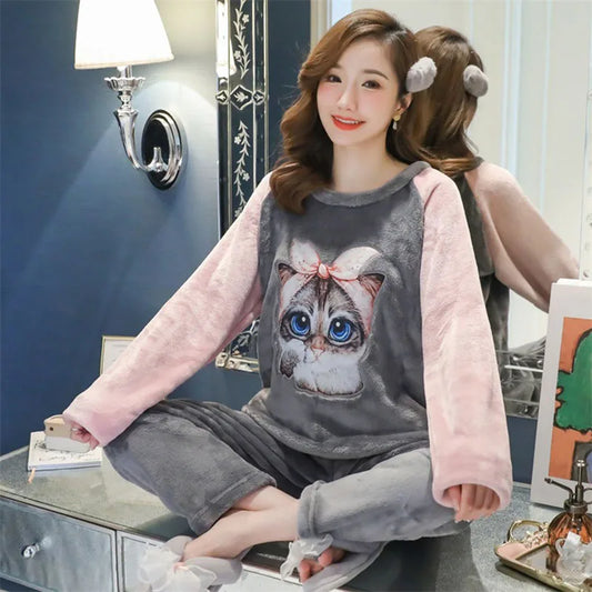 Thickened Warm Flannel Pajama Woman's Winter Cartoon Bear Dinosaurs Dog Cat Print Homewear Large Size Soft Sleepwear 2PCS/Set