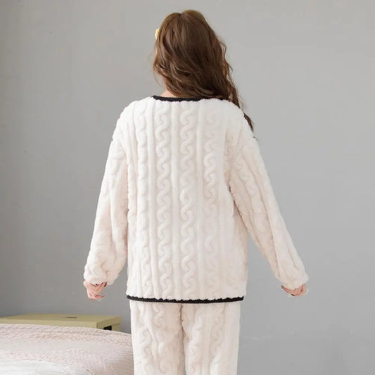 Womens Sweet Peach Knitted Pajamas Set Cardigan Fleece Coral Pajamas Flannel Pajamas Pajama Pants Set Thickened Homewear