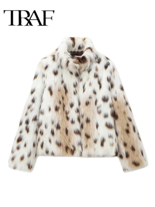 TRAF New Autumn Winter Leopard Faux Fur Coats 2024 Warm Open Maxi Coat Female Casual Loose Elegant Chic Street Retro Outwear