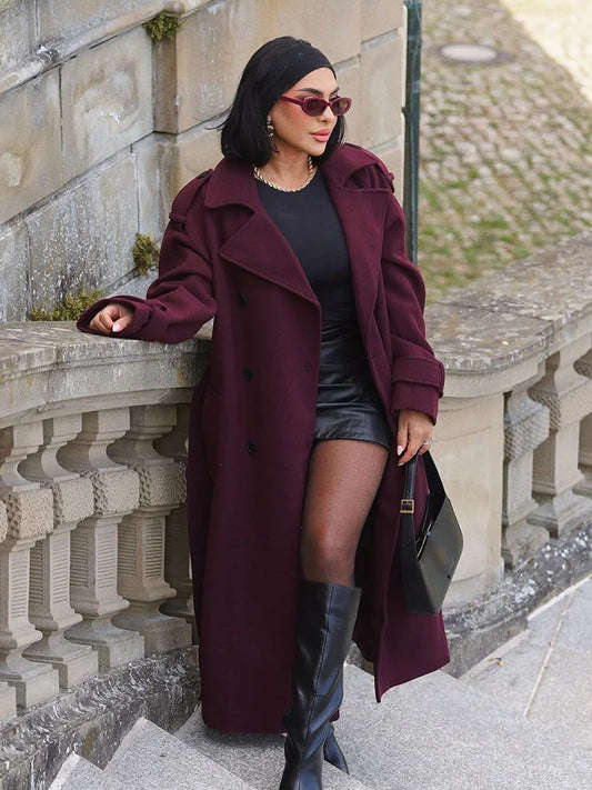Winter Women's Elegant Burgundy Blend Maxi Long Pea Coat Fashion Double-breasted Lapel Jacket Female Chic Trench Coat with Belt