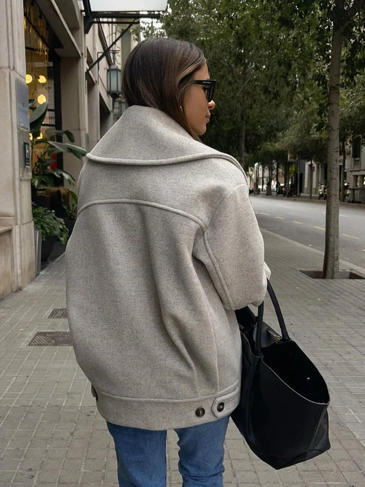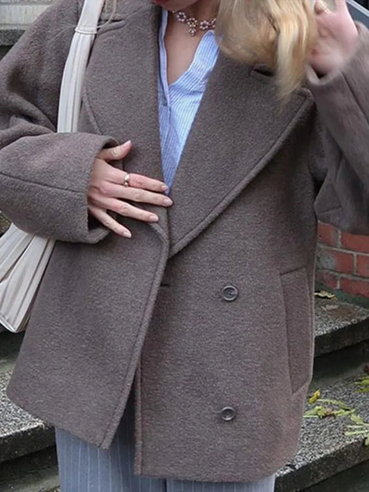Women's Oversized Solid Woolen Coats Casual Retro Double Breasted Lapel Short Jacket Office Lady Outerwear Autumn Winter 2024