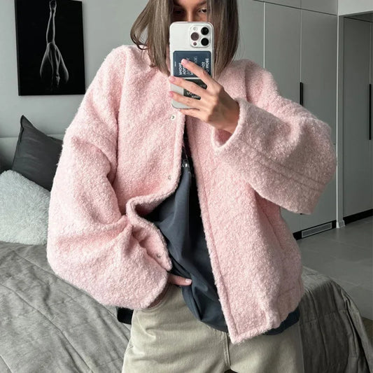 Chic Pink Short Fur Jacket Coat For Women 2024 Autumn Winter Thick Warm Stand Collar Pocket Loose Long Sleeve Jacket