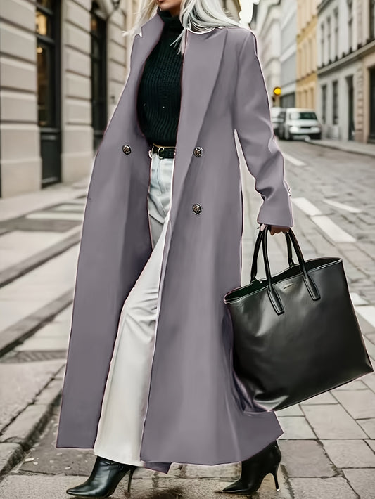 Women's Elegant Long Trench Coat - Light Purple Double-Breasted Overcoat with Lapel Collar, Chic Spring/Fall Outerwear for Casual or Professional Attire, Spring Trench Coat | Chic Streetwear | Smooth Fabric Finish