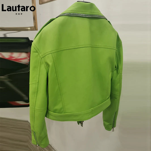 Regular price $197.99 CADRegular priceUnit price / per$314.99 CADSale price $197.99 CADLautaro Autumn Short Green Soft Faux Leather Biker Jacket Women Long Sleeve Zipper Belt Designer European and American Fashion