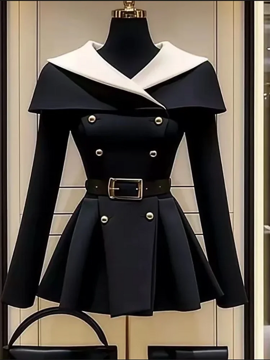Autumn Winter New Contrast Color Jacket Women's Outerwear Tight Waist Belt Double-Breasted Small Chanel Style Cardigan Coat Tops