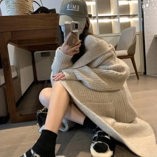 Laid-Back Hooded Loose-Fit Thickened Medium-Length Cardigan Jacket Extended Sweater Women's Autumn/Winter Knitted Top