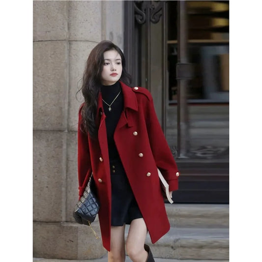 2025 NEW Double-Sided Cashmere Coat Red Women's Shoulder Insert Loose Belted Woolen Jacket Autumn Winter