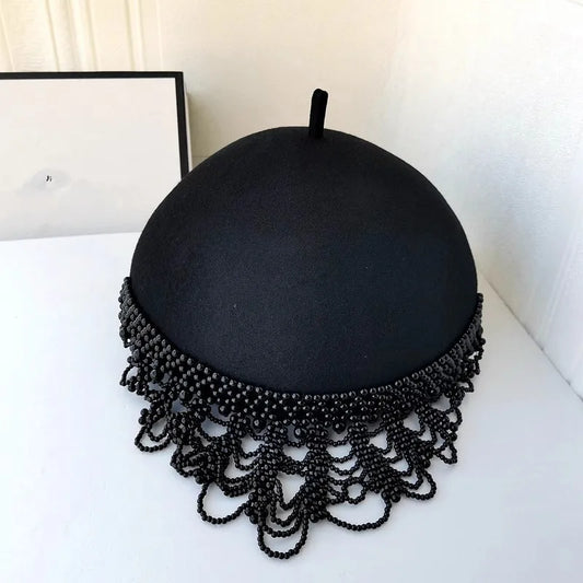 202508-shi chic dropshipping design wool Tassel pearl chain Elegant retro lady beret hat women painter hat