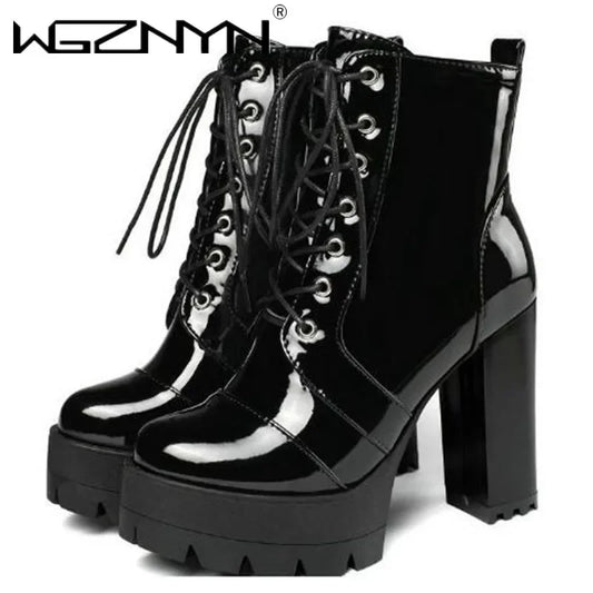 2026 Thick High Heeled Female Patent Leather Ankle Boots Round Toe Lace-up Zipper Women Short Boot Gothic Women Shoe Botas Mujer