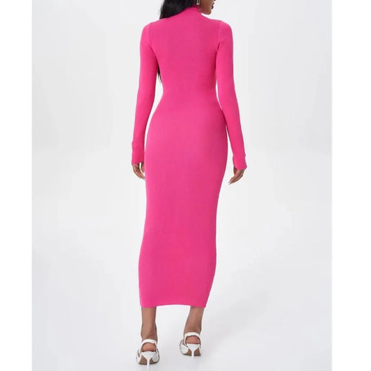 4 COLORS Sexy Plain Color Knitted Mock Collar Midi Long Dress Women Stretch Basic Bodycon Package Hips Full Sleeve Robe
