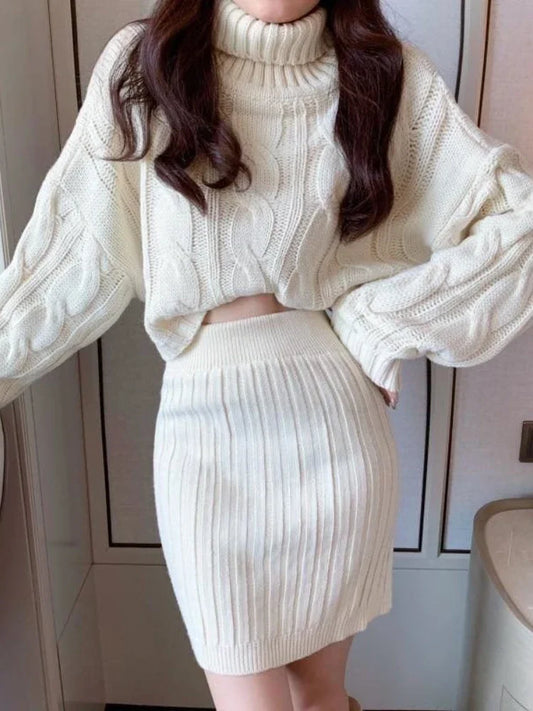 Winter Fashion New Women's South Korea Dongdaemun Knitted Sexy Short Skirt Set High Collar Warm Bag Hip Skirt Two Piece Set