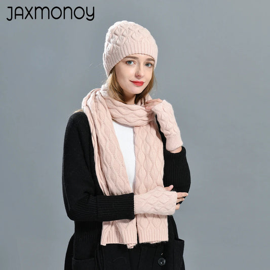 Winter Beanie Hat Scarf Set For Women Wool Blend Knitted Outdoor Warm Scarf Hat Gloves 3 Piece Set Beanies Hat With Real Fur
