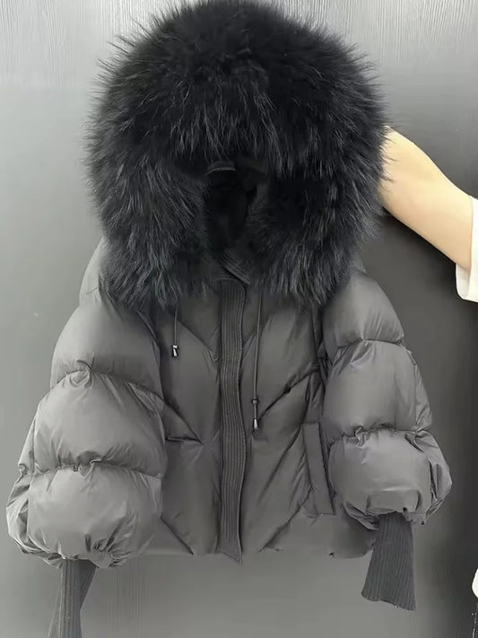 Winter Hooded Natural Large Fur Collar Down Jacket Women Short White Duck Down Outwear Female Lantern Sleeve Warm Quilted Jacket