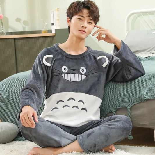 Winter Thickened Warm Flannel Men Pajamas Set Long-Sleeved Coral Velvet Sleepwear Homewear Cartoon Bear Nightwear Loungewear