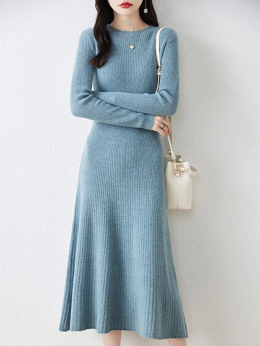 Women Knitted Dress 100% Wool Sweater Dress Autumn Winter Slim Knit Maxi Long Sweater Dress Lady Pullover Dresses Solid Jumpers