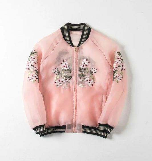 Women Luxury Floral Embroidery Bomber Jacket Perspective Coat Vintage Zipper Streetwear Outerwear Organza Cardigan Tops 2021